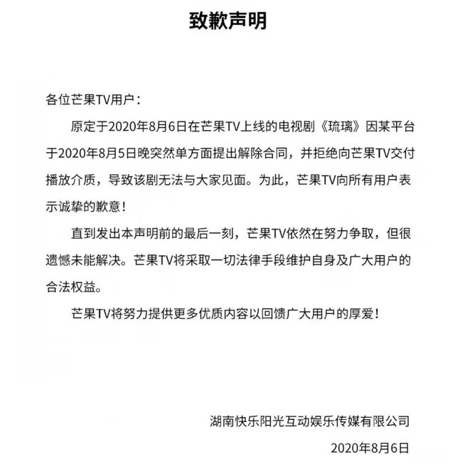 而且昨天该剧播出前,两大视频平台还闹出了幺蛾子,该剧原定是在优酷和芒果TV两个平台播出,但在开播前优酷单方向向他们提出解除合同,不给他们提供这部剧的播放介质,芒果TV官方昨天也发布了致歉声明,称这部剧有可能不在他们平台播出,但不到最后一刻,他们仍在努力争取这部剧的播放权。