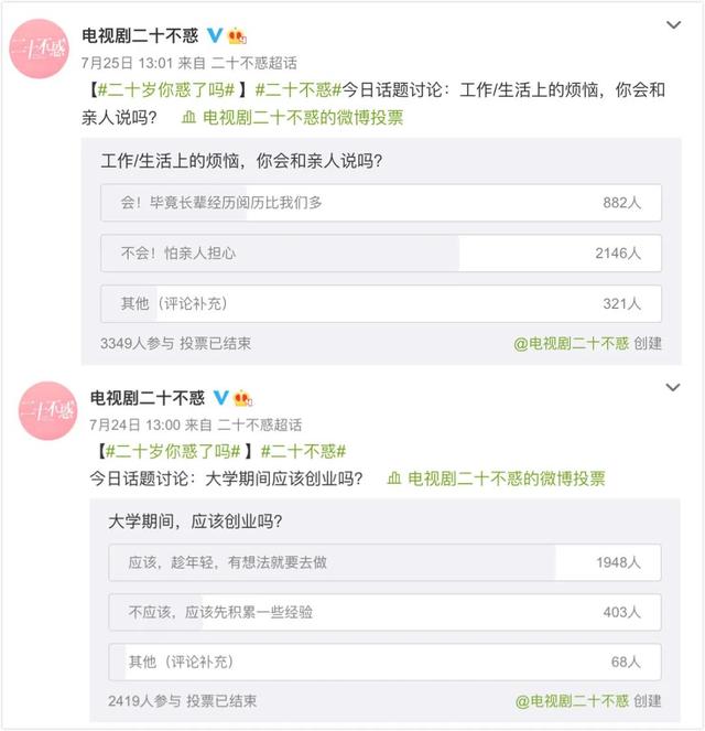 荧屏上,《二十不惑》从现实出发,关照初涉社会的轻人的痛点与成长;荧屏外,剧情生发的青春议题也引发观众广泛讨论。微博上,官微发起的话题投票活动吸引了不少关注,例如“那些错怪父母的事情,你道歉了吗”“大学期间应该创业吗”“工作/生活上的烦恼,你会和亲人说吗”……