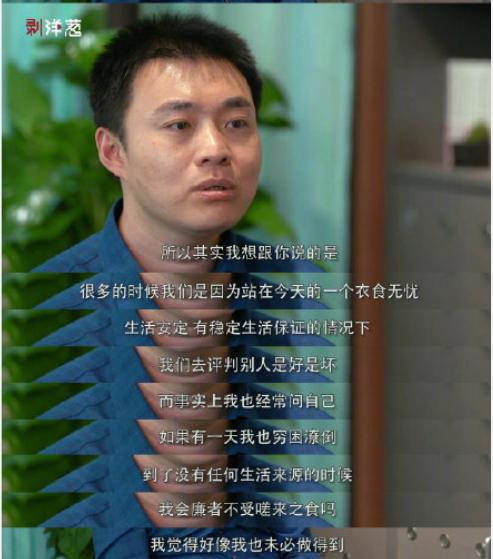 “很多时候我们是因为站在今天的一个衣食无忧、生活安定、有稳定生活保证的情况下,我们去评判别人是好是坏。而事实上我也经常问自己,如果有一天我也穷困潦倒,到了没有任何生活来源的时候,我会廉者不受嗟来之食吗?我觉得好像我也未必做到。”