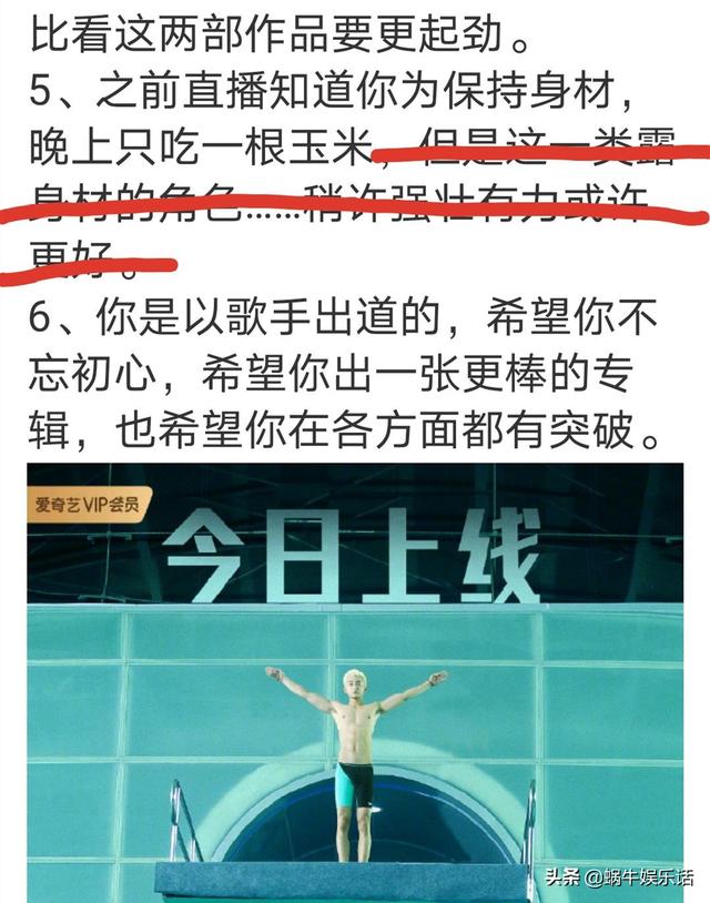 还有因为这是一部与跳水有关的电视,所以就会有一些“露肉”镜头,还有粉丝吐槽他身体有些单薄,看来想要演好这种类型的偶像剧,一些肌肉的配备是必不可少的。
