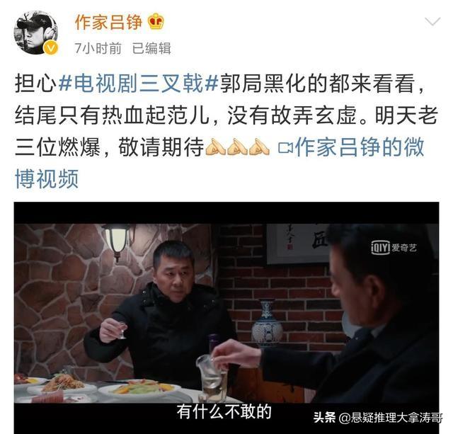 吕铮发的是一段最新的预告片花,配文中写:担心郭局黑化的都来看看,结尾只有热血起范,没有故弄玄虚。